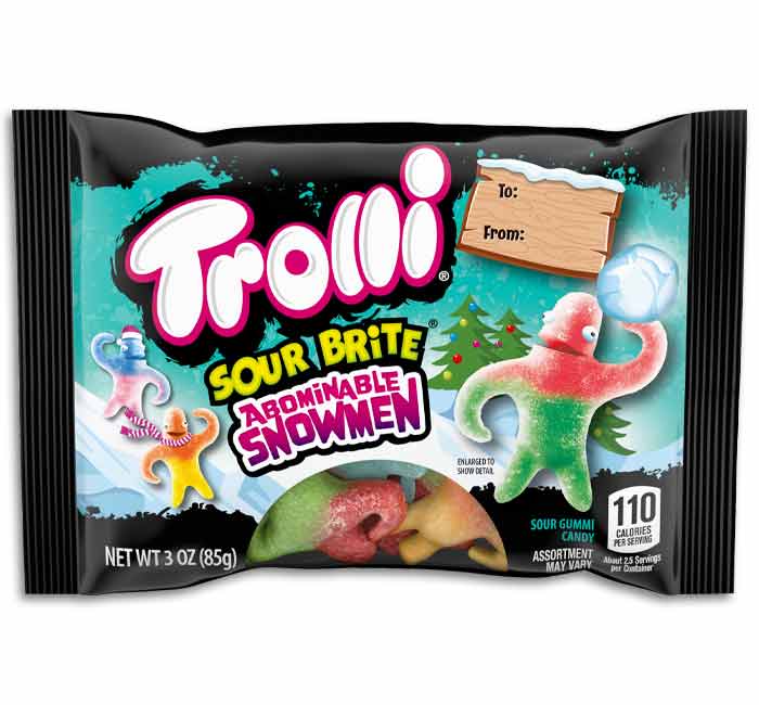 Not all snowmen are frozen, like these perfectly sweet AND sour Trolli Sour Brite Abominable Snowmen Gummy Candies! Great for gifting or to use as a stocking stuffer for sour candy lovers, these gummy sour snowmen candies come in three mouth-watering and tongue-twisting flavors like Mango-Passionfruit, Strawberry-Lime, and Blue Raspberry-Guava. Use the gift-ready "to" and "from" label on this tasty pouch to show someone sweet on your list some sour!