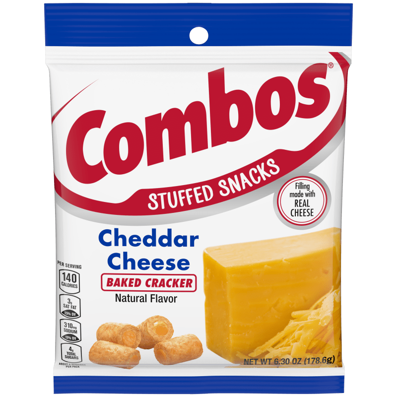 COMBOS Cheddar Cheese Cracker Baked Snacks are a deliciously savory way to tame your appetite. Crunchy oven baked crackers are stuffed with a creamy filling made with real cheese, creating a classic combination of flavors and your new favorite filling, tasty snack.
